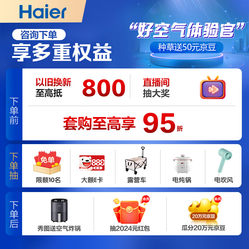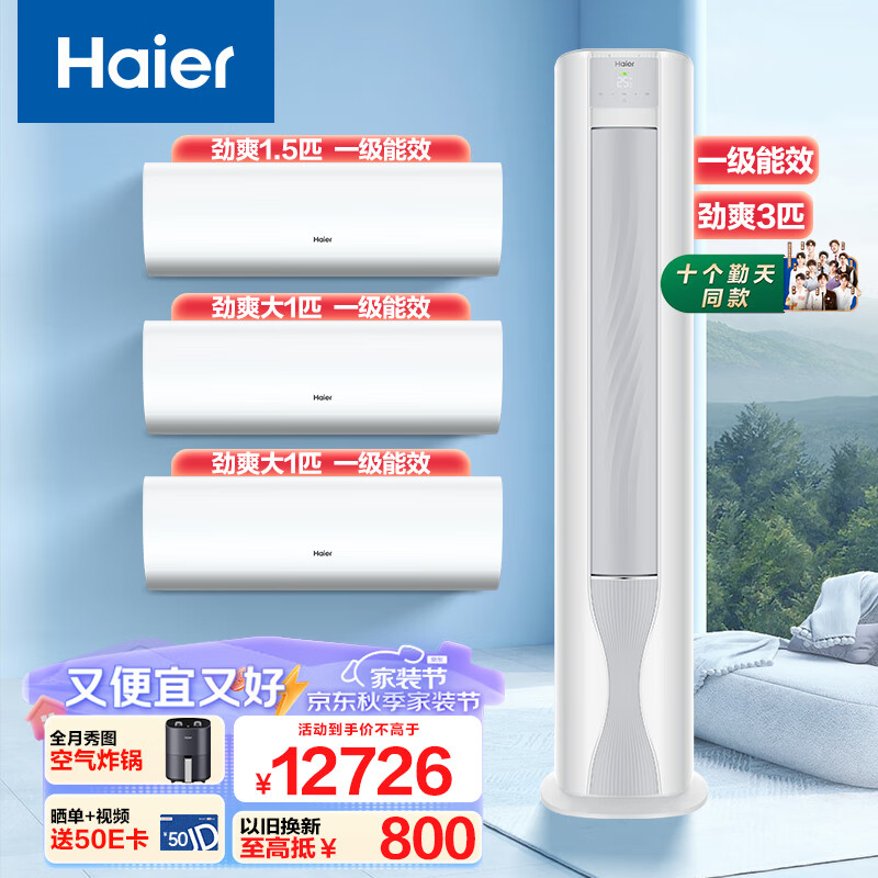 海尔(Haier)省电空调套装新一级能效省电 劲爽挂机荣耀柜机立式空调 1.5匹挂+大1匹挂*2+3匹柜 三室一厅套装价格:12726.00元!