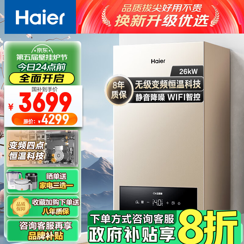 海尔(Haier)燃气壁挂炉天然气板换式静音采暖炉家用地暖供暖全屋热水节能WIFI智控多点恒温以旧换新L1PB26-HJ5价格:4299.00元!
