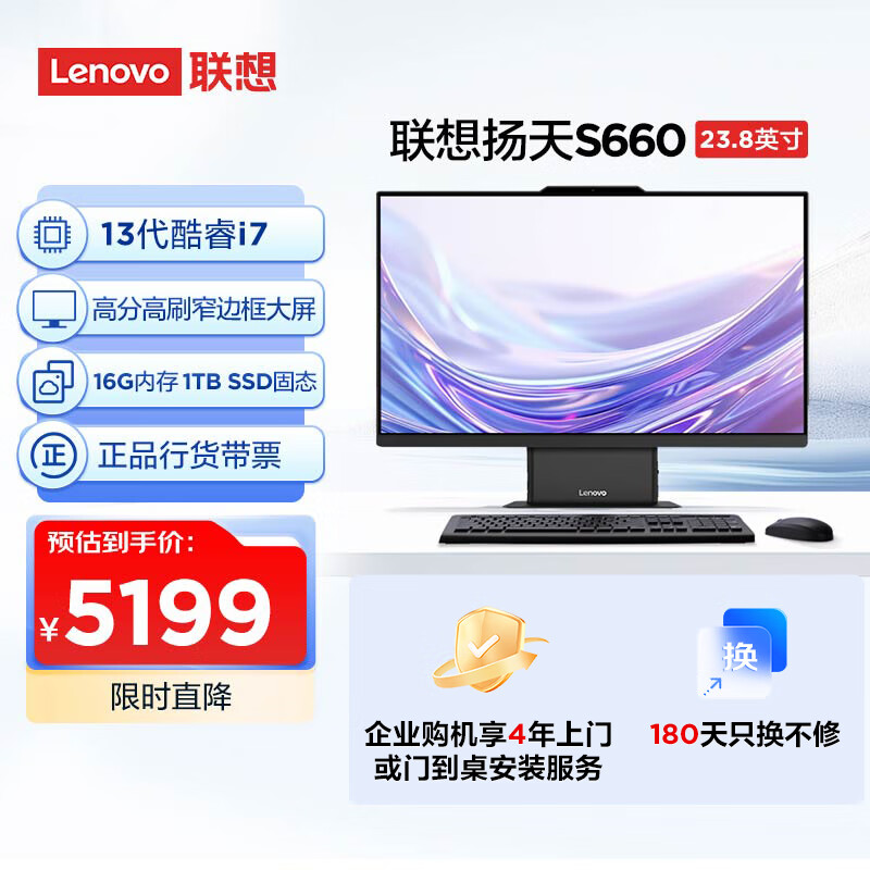 联想(Lenovo)扬天S660一体机台式电脑主机23.8英寸大屏(酷睿13代i7-13620H 16G DDR5 1TB SSD WiFi6)价格:5199.00元!