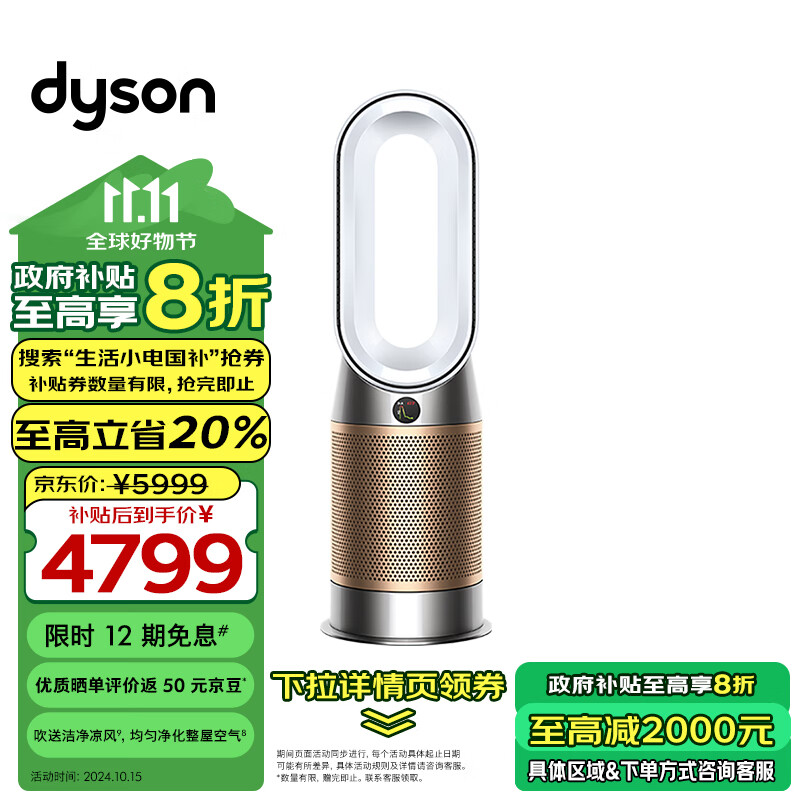 戴森DYSON HP09 多功能无叶暖风扇 兼具空气净化器取暖器功能 除过敏原 滤除花粉 宠物毛发 白金色价格:5999.00元!