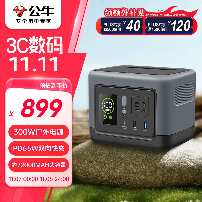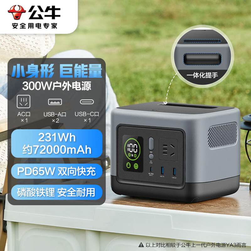 公牛【3C认证】300W户外电源 便携PD65W双向快充 220v充电宝 72000mAh大容量停电应急露营备用移动电源价格:1058.00元!