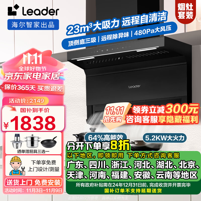 海尔(Haier)智家出品抽油烟机燃气灶套装 挥手智控 7字型23立方油烟机家用L9X7QU1烟灶套装5.2KW聚能灶价格:2449.00元!
