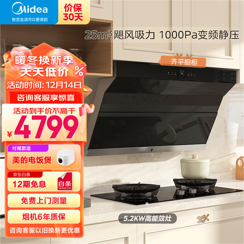 美的(Midea)抽油烟机灶具套装 顶侧双吸油烟机家用25风量变频巡航超薄双吸烟灶套装AC7+Q529L天然气套装价格:4799.00元!