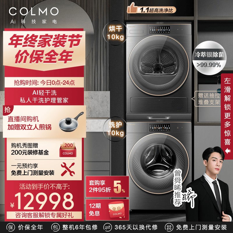 COLMO洗烘套装 滚筒洗衣机全自动+热泵式烘干机 AI轻干洗 冷萃银除菌 画境系列 CLGW10HE-E+CLHZ10HE-E价格:12998.00元!
