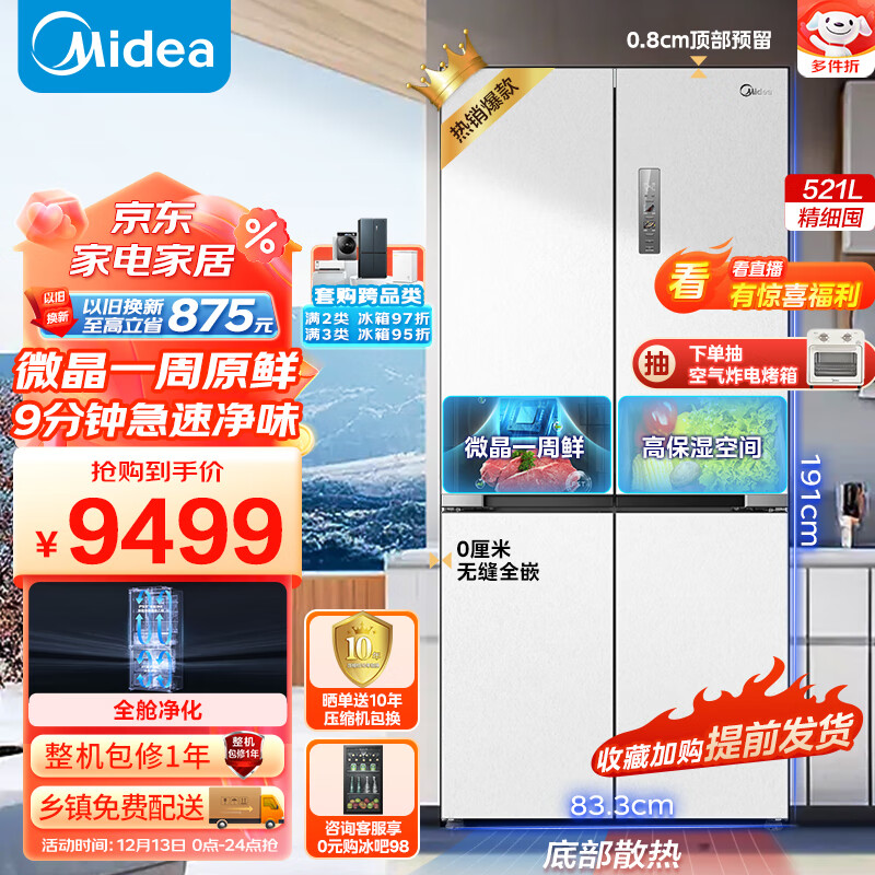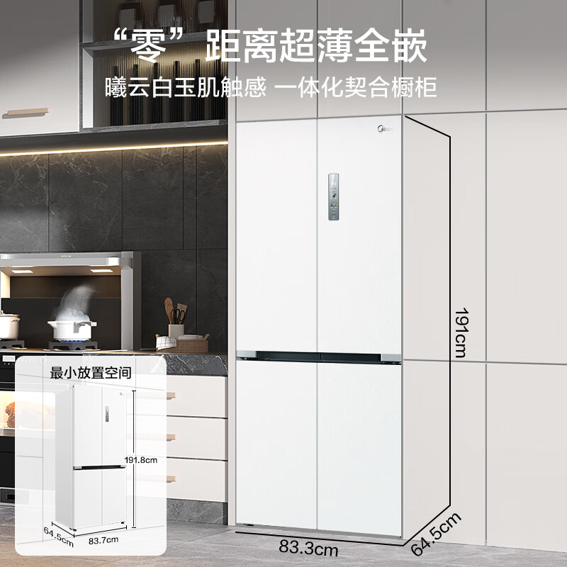 美的(Midea)微晶系列547白色净味无缝全嵌十字双开门四开门超薄大容量一级变频家用智能电冰箱MR-547WUSPZE价格:9999.00元!