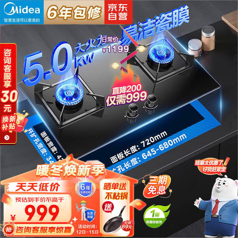 美的(Midea)燃气灶双灶家用5.0KW大火力黑晶宽面板台嵌两用双灶液化气灶Q330价格:999.00元!