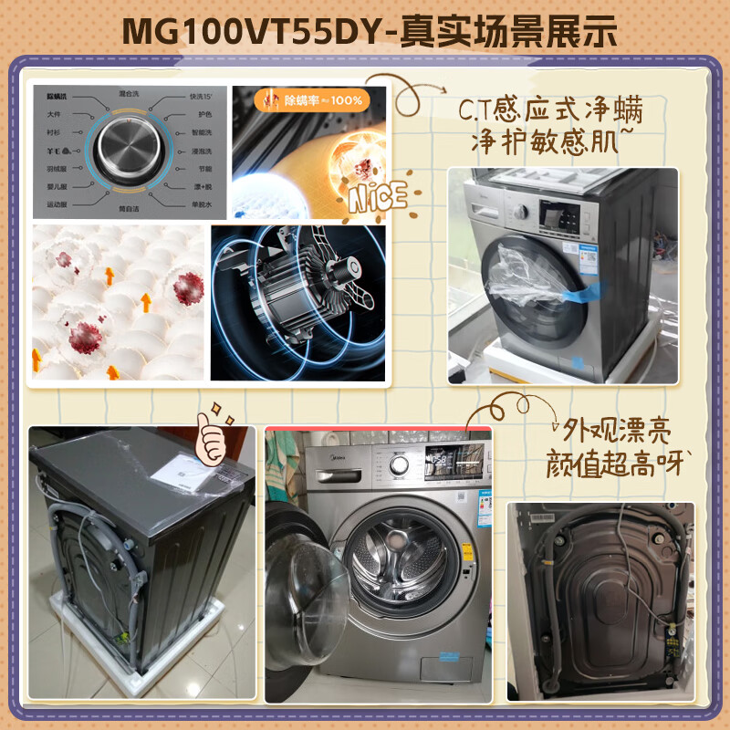 想了解美的MG100VT55DY的网友有不少,这回就给大家介绍一下,这个新出来的,很受欢迎,洗净效果:安装好就洗了一桶衣服,容量比以前的洗衣机大很多,洗得也干净,并且声音也小,关键是比起波轮洗衣机真的是要省好多水呀!价格实惠,性价比高。非常满意的一次购物。