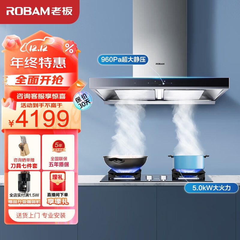 老板(Robam)抽油烟机 领航家D1S双腔变频吸油烟机家用烟灶套装22m3/min燃气灶60D1S+57B2D液化气价格:4199.00元!