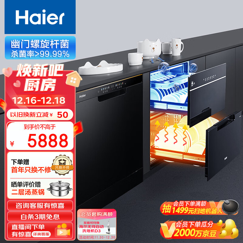 海尔(Haier) 消毒柜 洗碗机 115L大容量 三层嵌入式消毒碗柜E07JU1 15套晶彩系列嵌入式洗碗机一级能效价格:6539.00元!