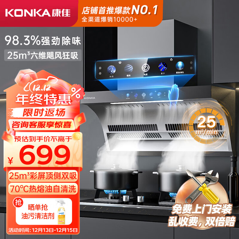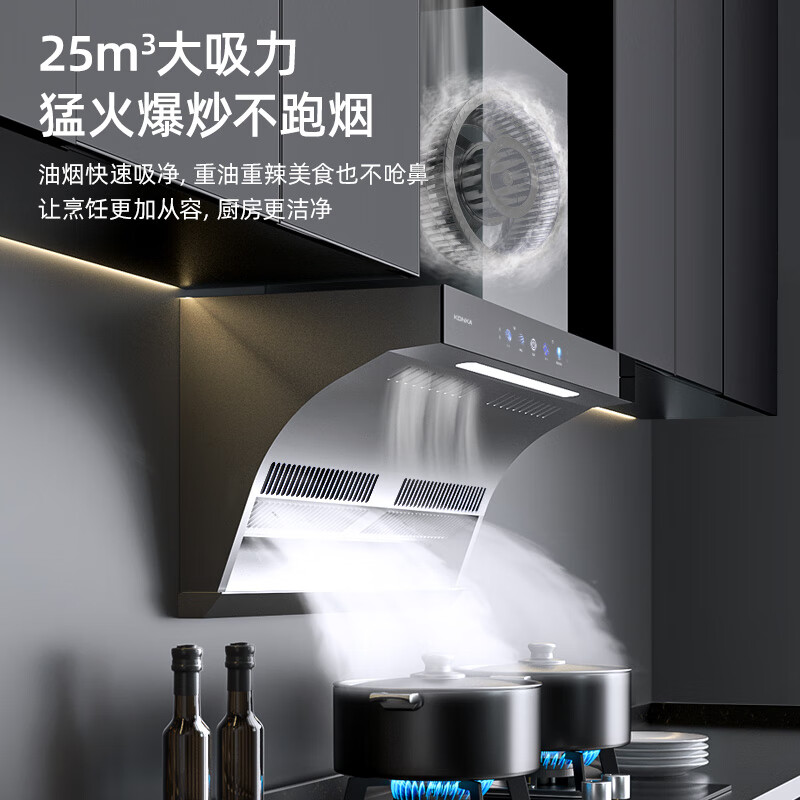 康佳(KONKA)抽油烟机 顶侧双吸式 7字型家用25m3爆炒大吸力 彩屏智能触控 挥手控制 自清洗 CXW-330-KL81价格:699.00元!