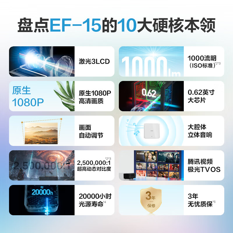 爱普生(EPSON)EF-15W 投影仪 3LCD高亮家庭影院智能投影机(0.62”大芯片 1000流明 激光 3LCD技术)价格:3299.00元!