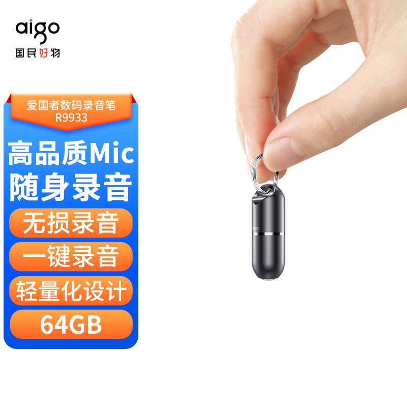 爱国者aigo录音笔R9933 64G 一键录音智能商务录音器专业录音 高清降噪录音笔 学习会议采访 黑色价格:259.00元!