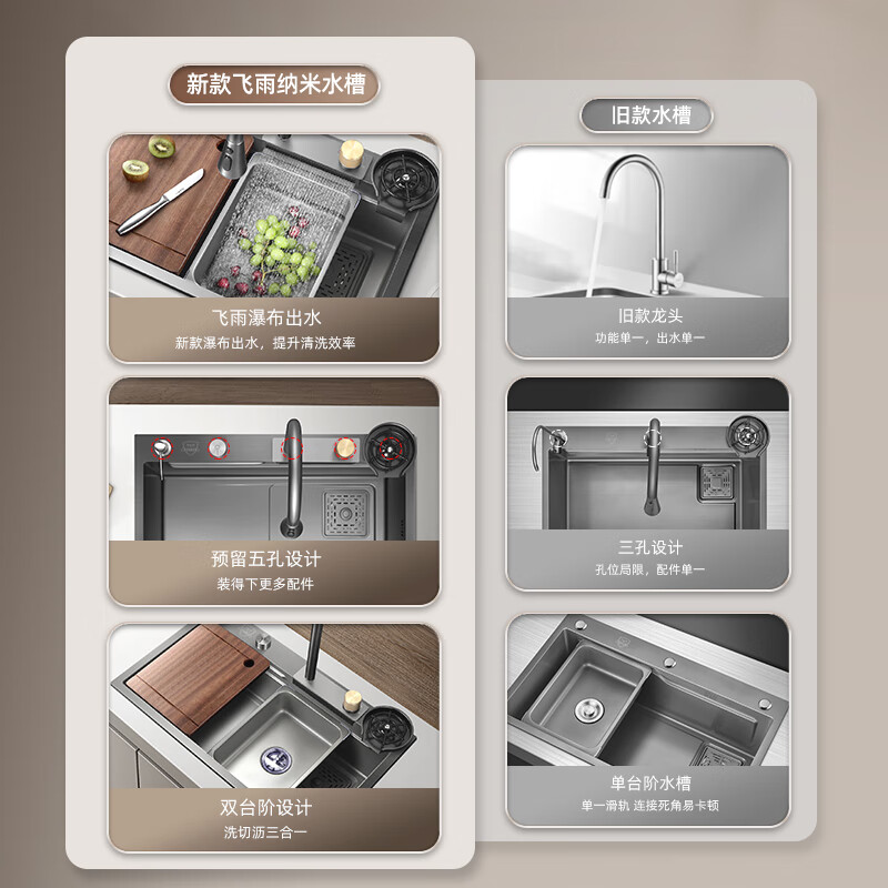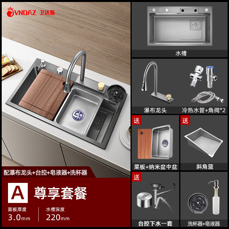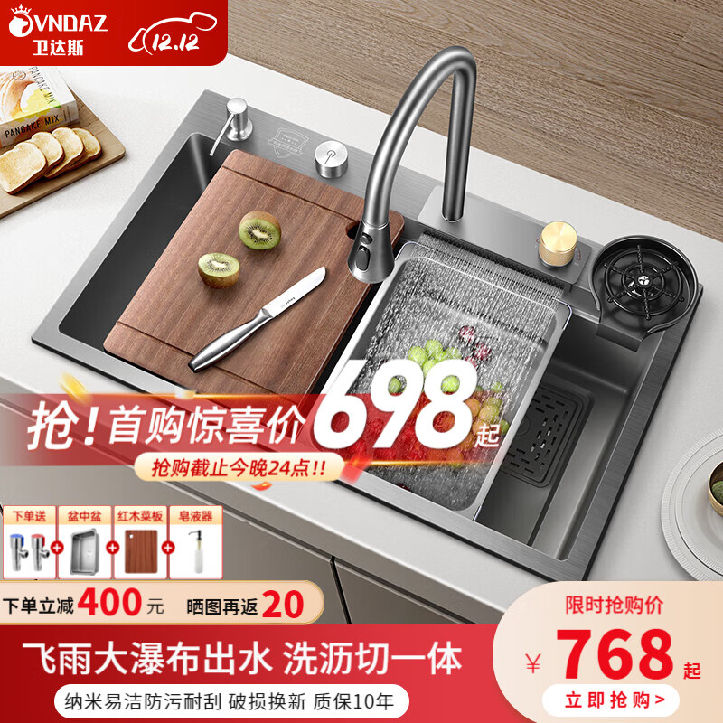 卫达斯厨房水槽大单槽台下盆 飞雨瀑布洗菜盆一体盆不锈钢洗菜盆洗碗槽 7545配飞雨龙头+配件全套价格:1198.00元!
