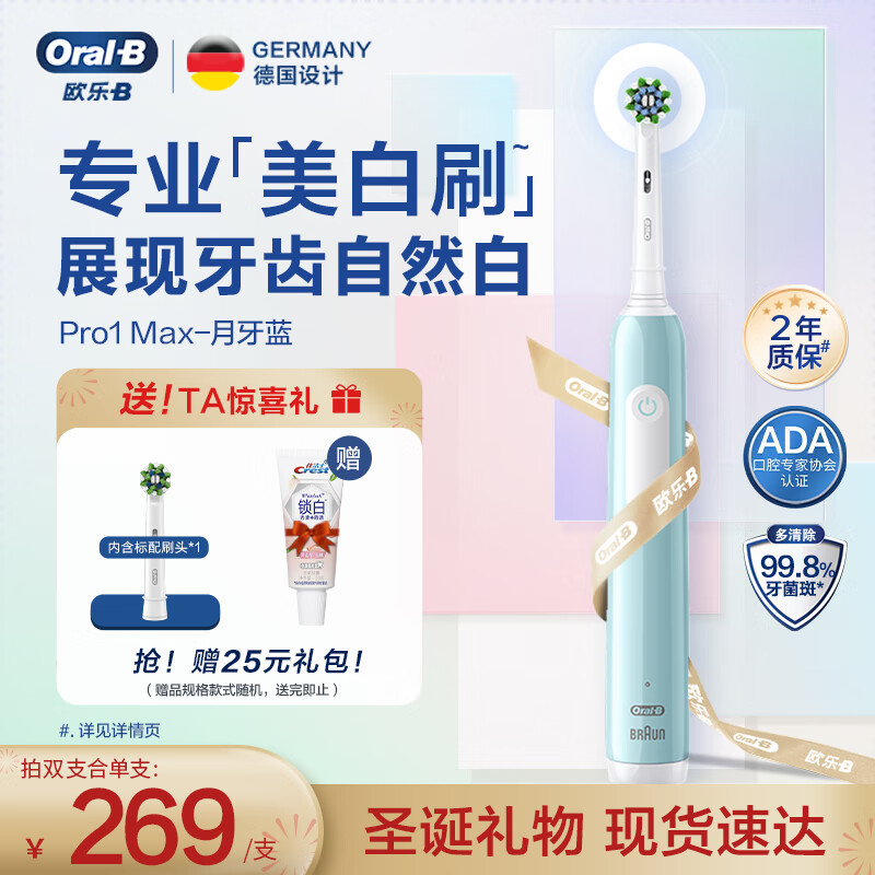 欧乐B成人电动牙刷成人 Pro1 Max美白刷 月牙蓝 牙齿美白Pro系列圆头 送男友送女友情侣送礼赠生日礼物价格:279.00元!