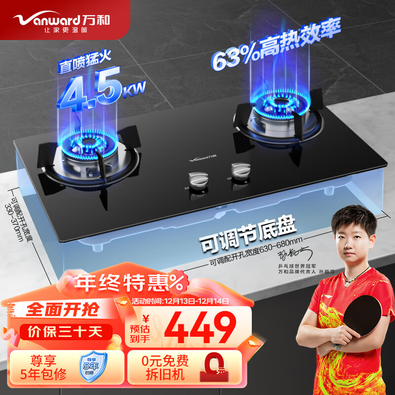 万和(Vanward)燃气灶4.5KW大火力 家用台式嵌入式两用 燃气灶具 双眼灶 63%热效率 JZY-B5L30(液化气)价格:449.00元!