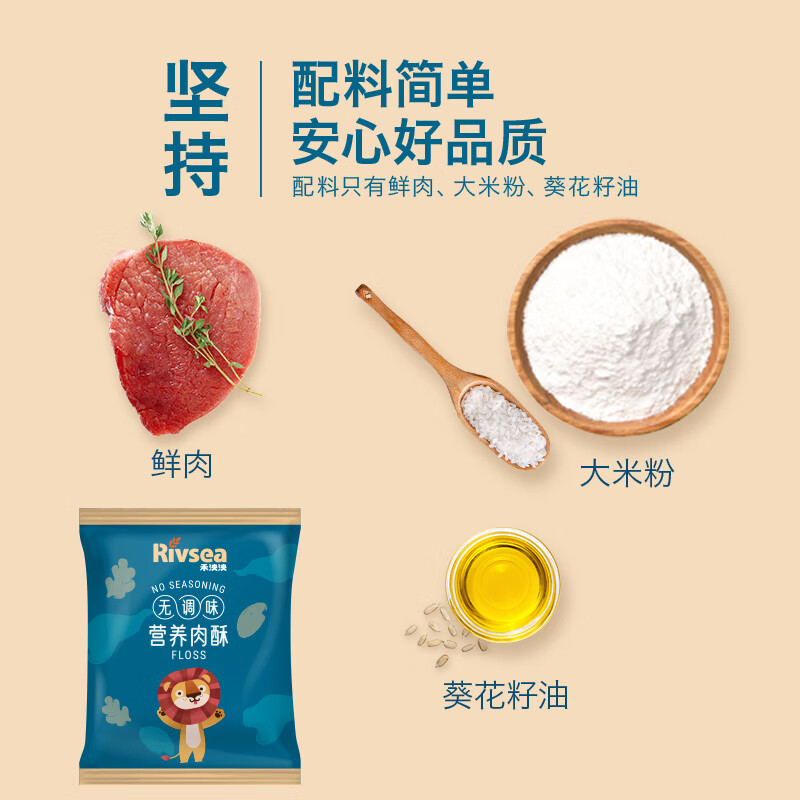 3、首先,配料表干净,给孩子吃起来很放心,其次孩子吃辅食放点肉松孩子很爱吃,包装都是小包装,每次吃起来很方便,也很卫生,不用担心吃不完变潮!