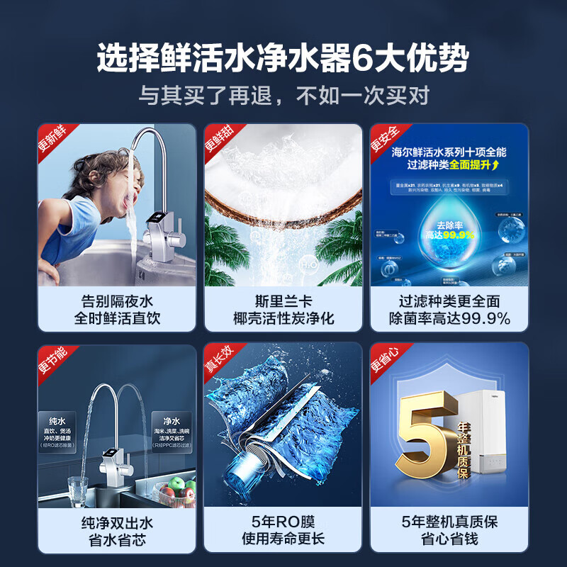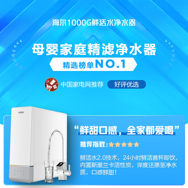 1、对比了很多家的净水器,还是选择了海尔净水器1000G鲜活水PRO,出水量大,TDS值基本在18上下,机器有5年质保,用的放心。安装师傅操作熟练,安装规范,很满意。