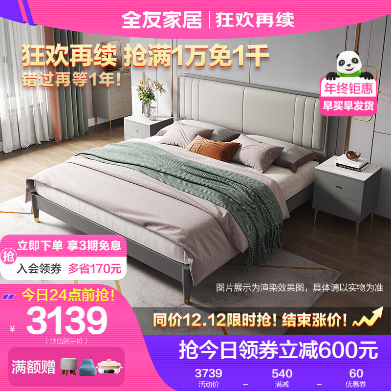 全友家居 床现代轻奢卧室双人床 实木框架带软包床屏框架床126901A价格:3739.00元!