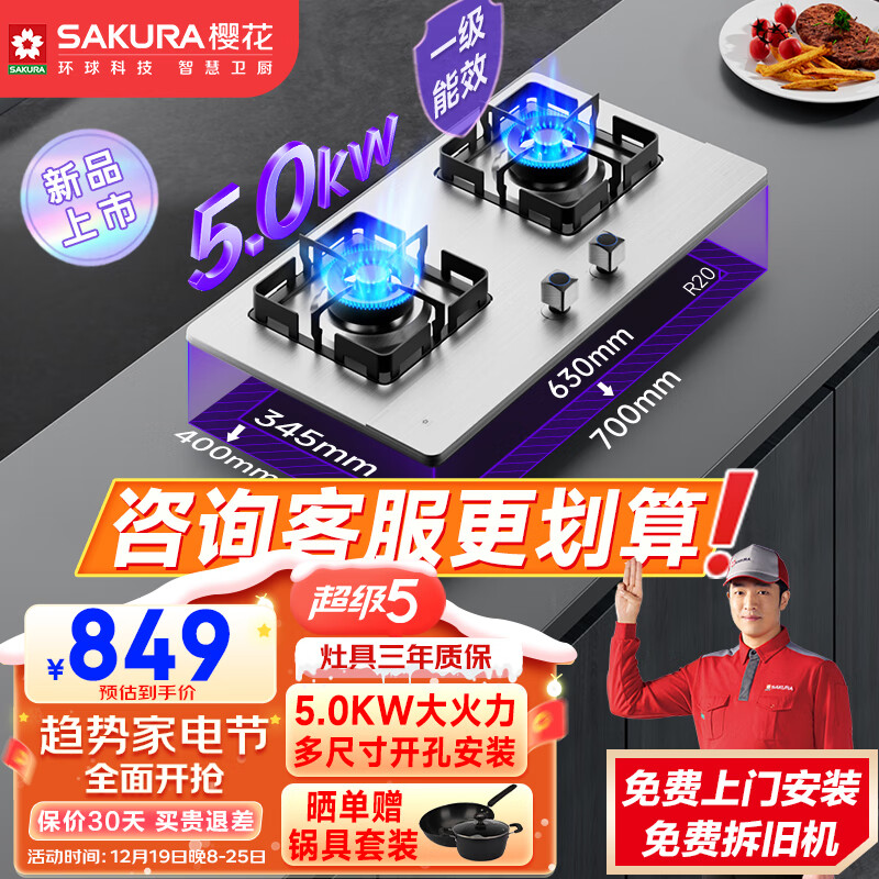 樱花(SAKURA)燃气灶家用燃气灶液化气灶双灶台嵌两用5.0kW大火力猛火灶易打理多尺寸可安装灶具灶台TSC01液化气价格:1049.00元!