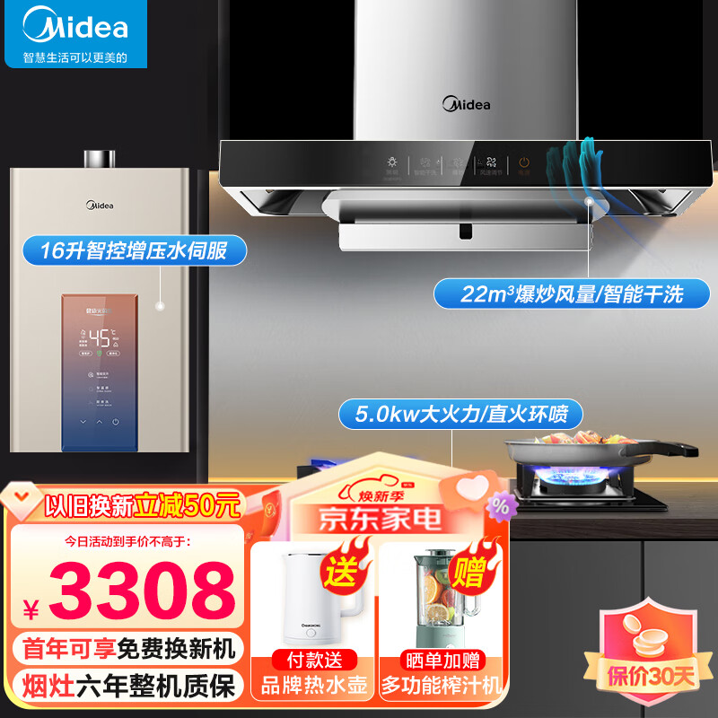美的(Midea)顶吸抽油烟机家用22立方大吸力油烟机燃气灶具热水器厨房电器三件套天然气以旧换新TN306+330+MK3价格:3308.00元!