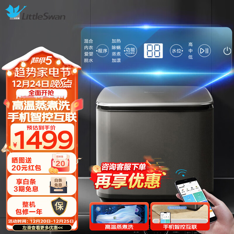 小天鹅(LittleSwan)内衣裤迷你洗衣机 小型母婴儿袜子高温除螨除菌1公斤波轮全自动WiFi版巴赫银TNB10-01WY价格:1499.00元!