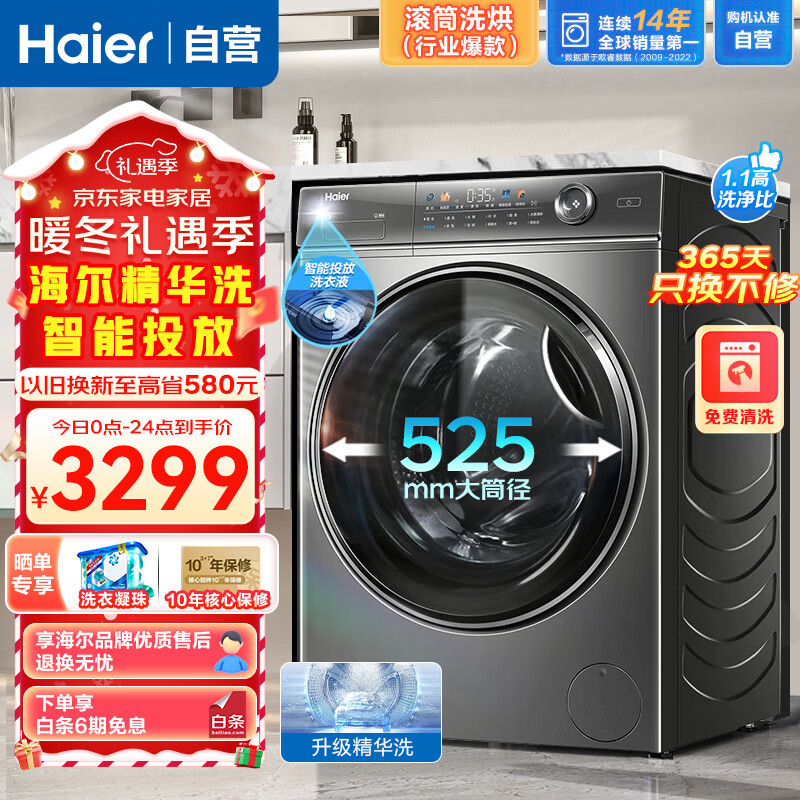 海尔(Haier)10KG洗衣机全自动变频滚筒家用一级能效智能投放525筒径速洗香薰除菌精华洗1.1洗净比价格:2699.00元!