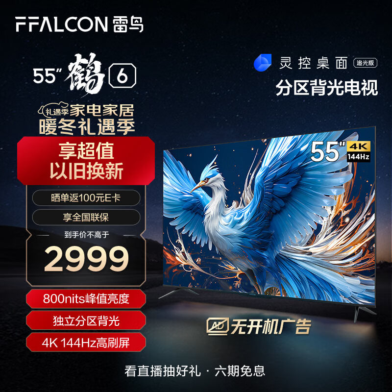 FFALCON雷鸟 鹤6 24款 55英寸游戏电视 144Hz高刷 4K 3+64GB 智能液晶平板电视机以旧换新55S575C PRO价格:2999.00元!