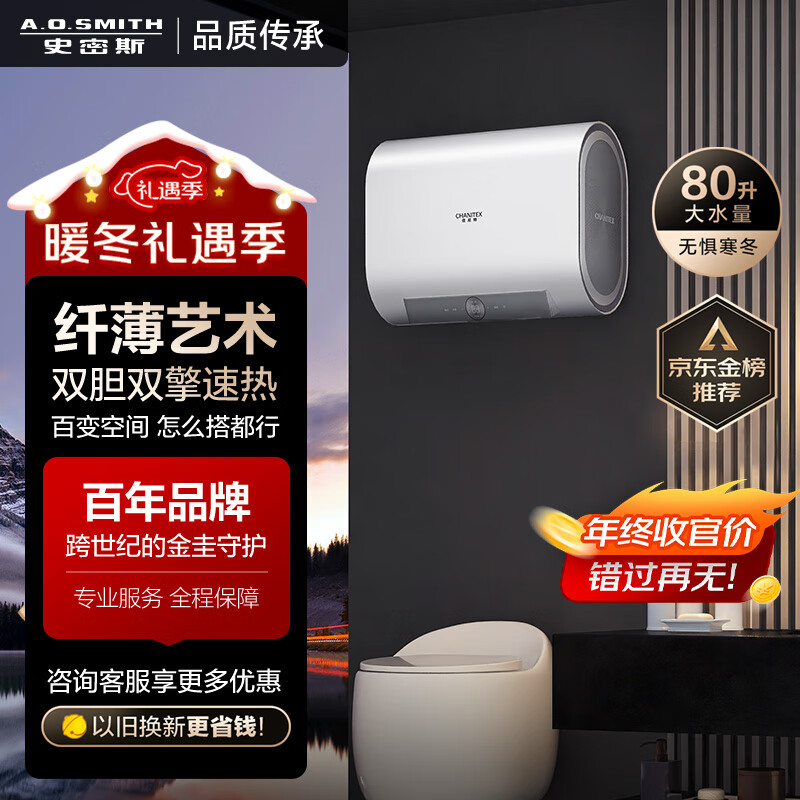 史密斯(A.O.SMITH)佳尼特80升电热水器 纤薄双胆扁桶 金圭内胆 双棒双3kW速热 雪域白 CTE-80HT1多种洗浴模式价格:3199.00元!