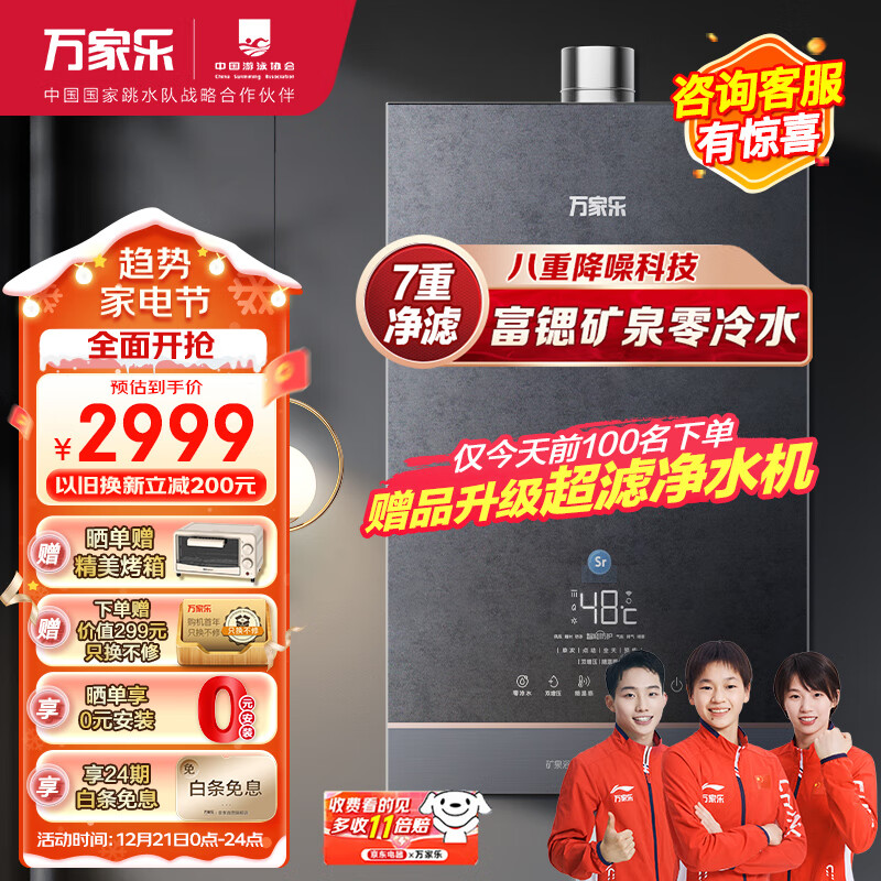 万家乐18升零冷水燃气热水器水伺服恒富锶矿泉瀑布洗降噪天然气家用双效增压JSQ34-18RL9价格:2999.00元!