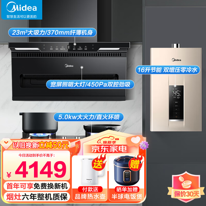 美的(Midea)家用抽油烟机顶侧双吸23立方大吸力油烟机燃气灶具热水器厨房电器三件烟灶套装天然气DC2+330+NT1S价格:4149.00元!