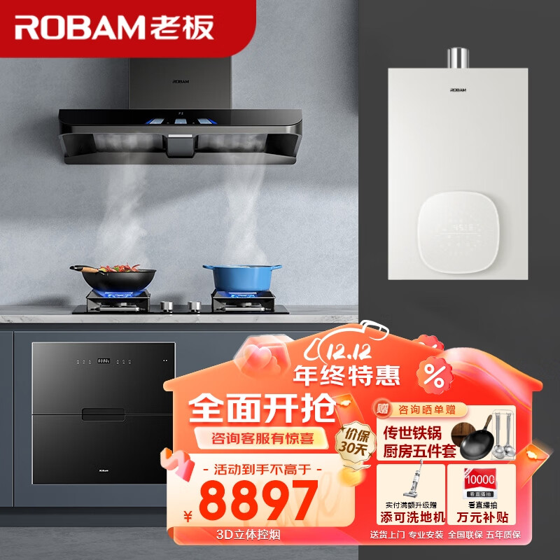 老板(Robam)钢琴家D3S智能变频24风量立体控烟抽油烟机灶具消毒柜燃气热水器62D3S+57B2DT+XB710A+HT322A-16价格:8897.00元!
