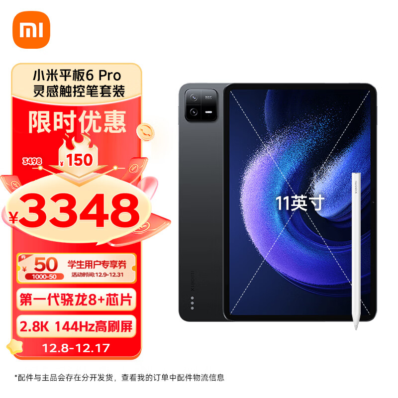 小米平板6Pro 11英寸 骁龙8+强芯 144Hz 2.8K超清 12+256GB 移动办公娱乐平板电脑 黑色【触控笔套装】价格:3348.00元!