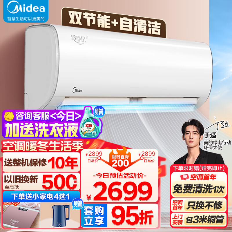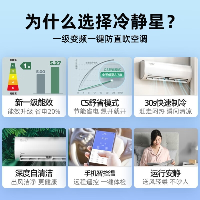 美的(Midea)空调冷静星二代大1.5匹新一级变频冷暖防直吹自清洁家用壁挂式挂机 KFR-35GW/BDN8Y-PH200(1)A价格:2699.00元!