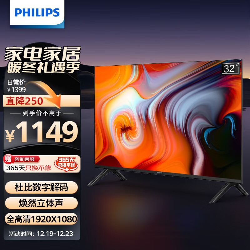 飞利浦(PHILIPS)32英寸 全高清智慧屏 老年人家用小屏卧室无线投屏 教育电视智能平板液晶电视 32PFF6899/T3价格:1199.00元!