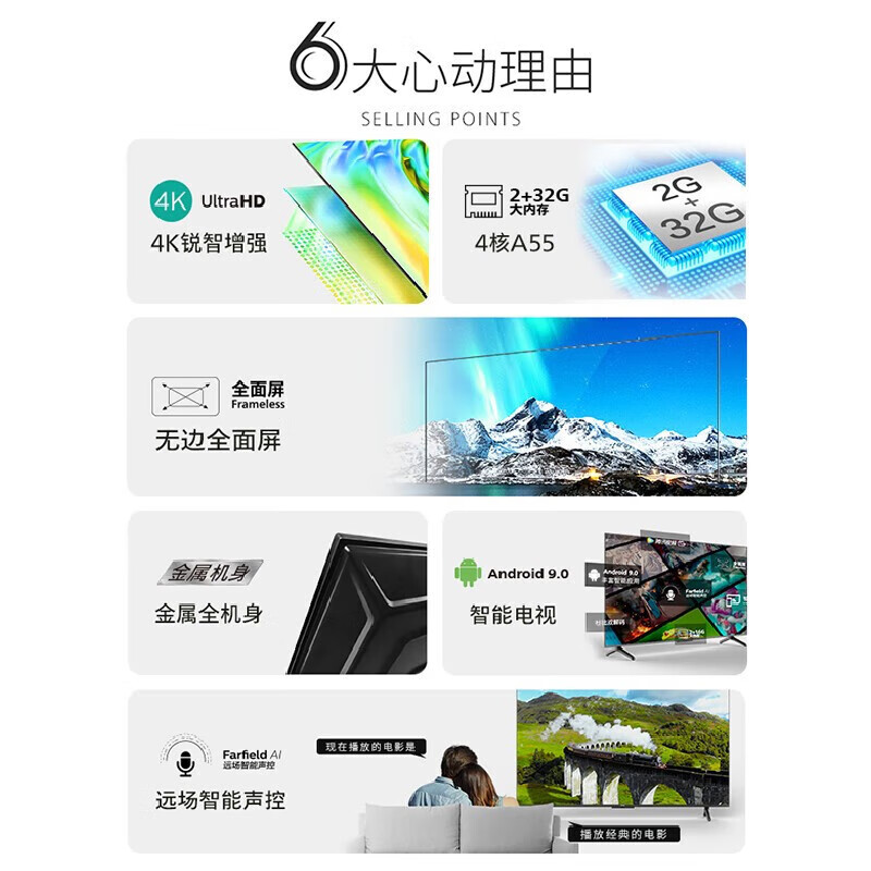 5、声音,画质俱清晰,元旦活动买的70寸,尺寸家用够大,这个价钱物所超值外形外观:无边框大气运行速度:流畅无卡顿屏幕音效:电影,电视剧,音乐,高音不刺耳,人声清晰,低音有力尺寸大小:合适家用安装同步:自己安装的,简单