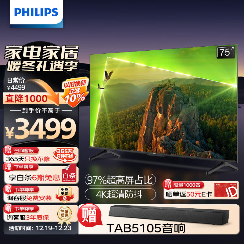 飞利浦(PHILIPS)75英寸 4K超高清智慧屏 金属机身 客厅影音远场AI语音智能液晶平板电视机 75PUF7108/T3价格:3499.00元!