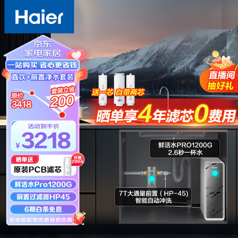 海尔(Haier)净水器1200G鲜活水pro6年RO反渗透厨下直饮3.48L/分钟净水器+前置过滤器HKC3000-R793D2U1+HP45价格:3218.00元!