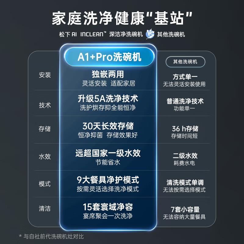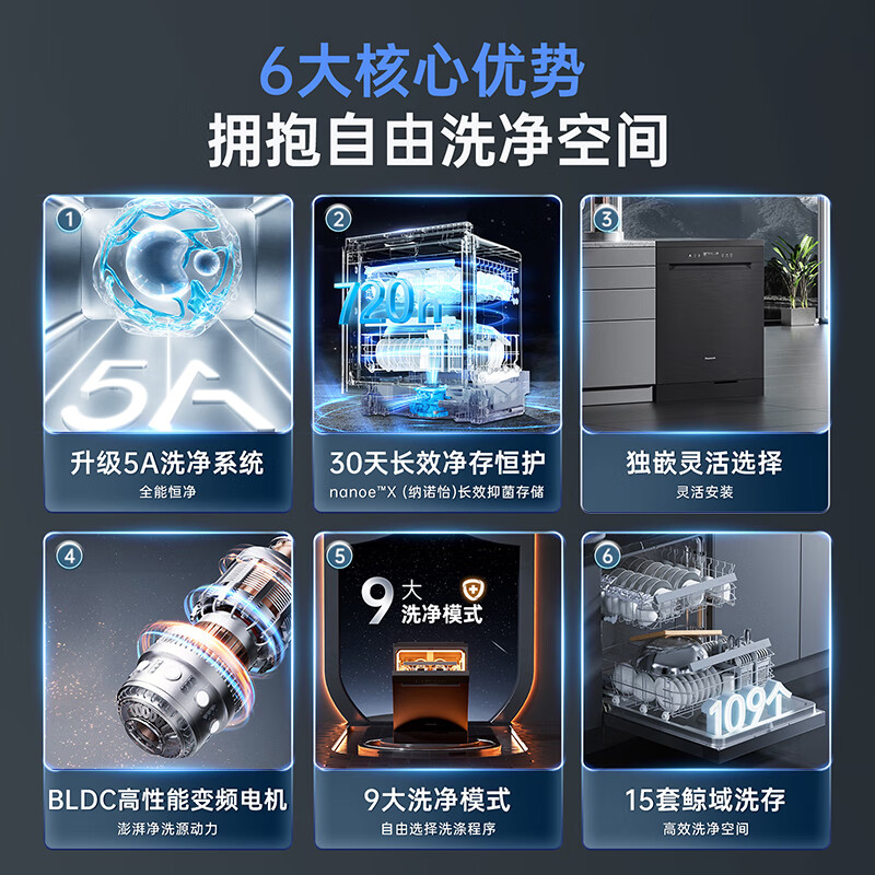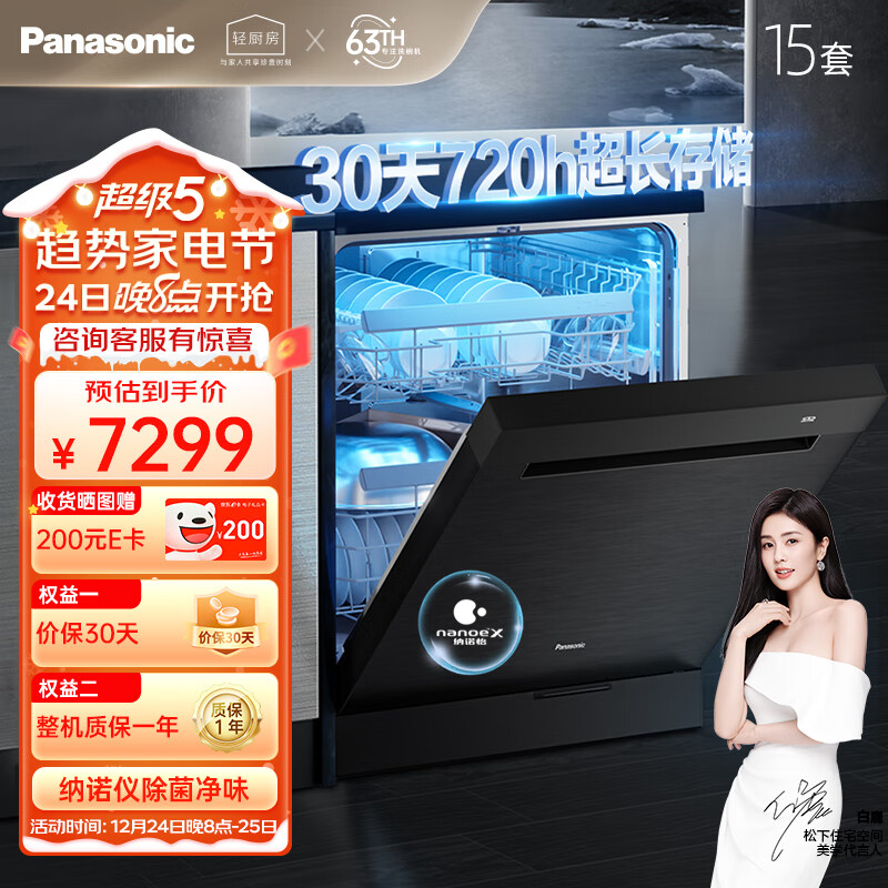 松下(Panasonic)15套 A1+ X系列台式嵌入式太空舱洗碗机 一级水效 纳诺怡 高温除菌 沙漠烘干 720h储存 NP-DW3K1KD价格:7299.00元!