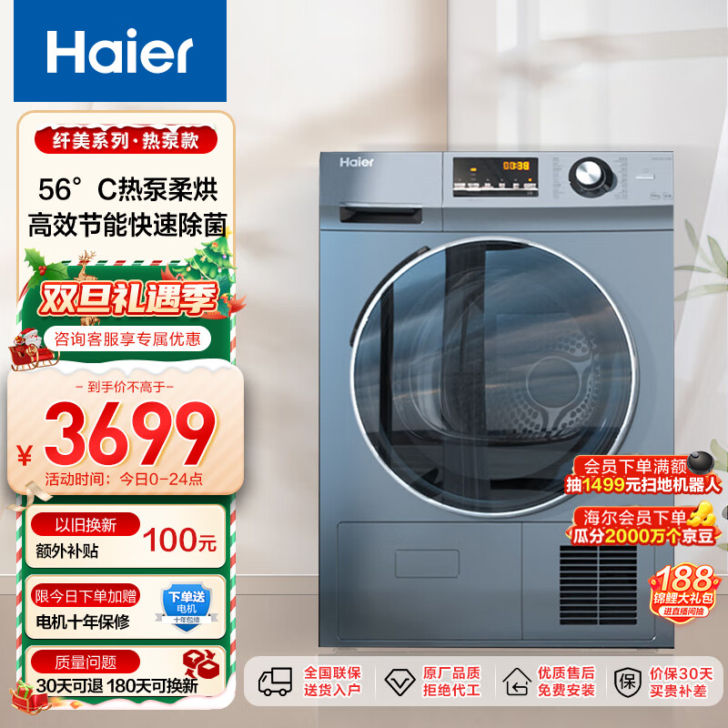 海尔(Haier)烘干机家用 10公斤热泵干衣机 防缠绕 速烘节能 除菌除潮除螨 GBN100-636 以旧换新价格:3899.00元!