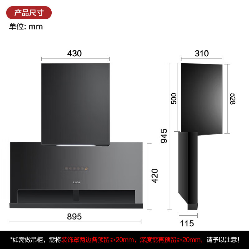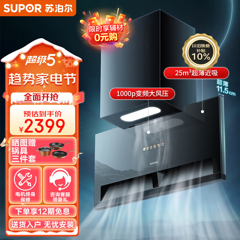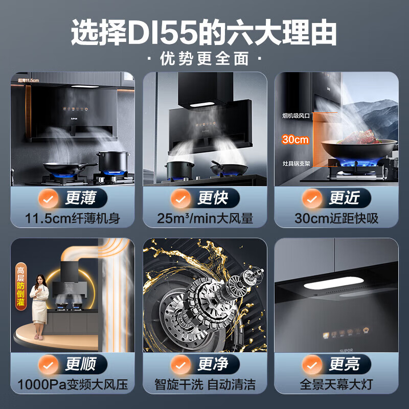 苏泊尔(SUPOR)抽油烟机家用烟机 25立方大吸力 超薄低吸双腔吸烟 1000Pa变频挥手免拆洗吸油烟机DI55价格:2599.00元!