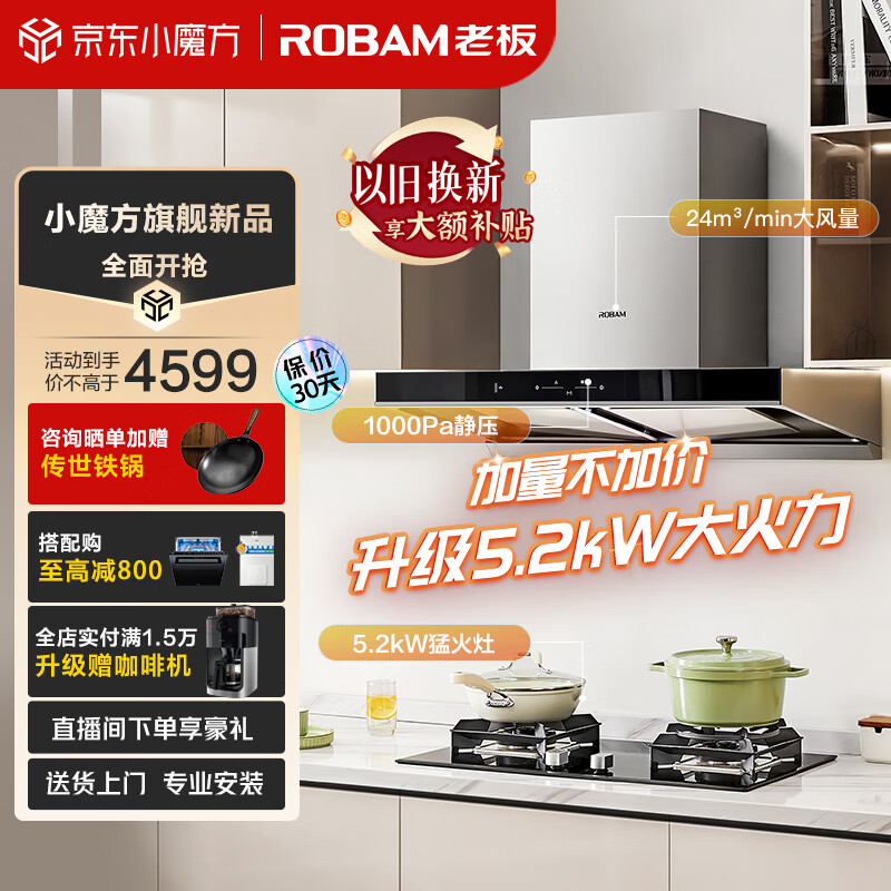 老板(Robam)抽油烟机免拆洗欧式顶吸双腔变频24大吸力烟机家用燃气灶吸油烟机灶具智能挥手60D3S套装(天然气)价格:4599.00元!