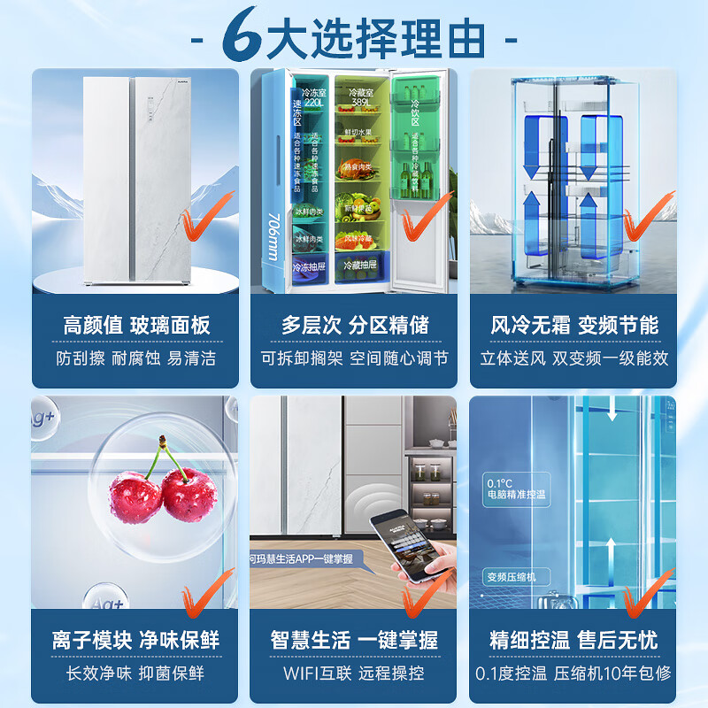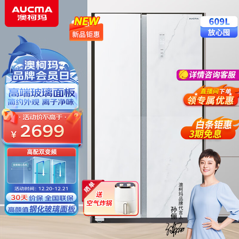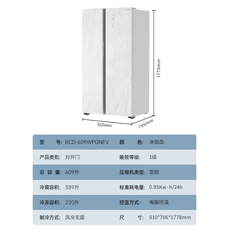 澳柯玛(AUCMA)609升对开门冰箱双开门冰箱家用一级能效变频无霜大冷冻玻璃面板 冰珀白 以旧换新 BCD-609WPGNEV价格:2999.00元!