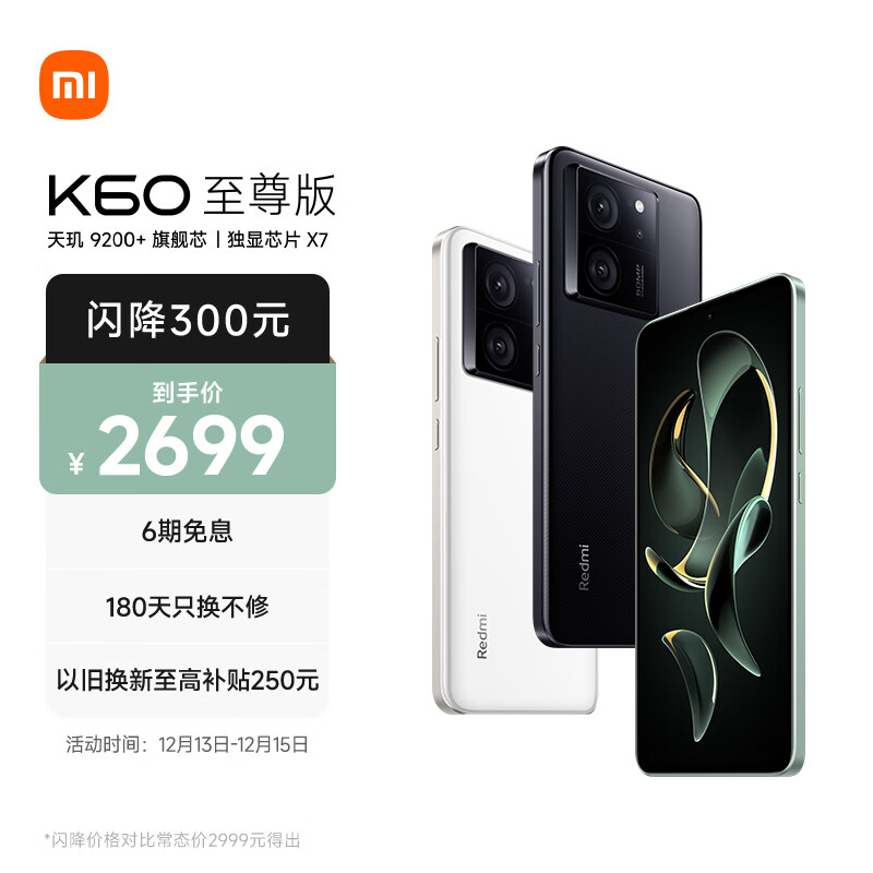 Redmi K60 版 天玑9200+ 独显芯片X7 1.5K直屏 索尼IMX800 光学防抖 16GB+512GB 墨羽 小米红米K60 Ultra价格:2699.00元!