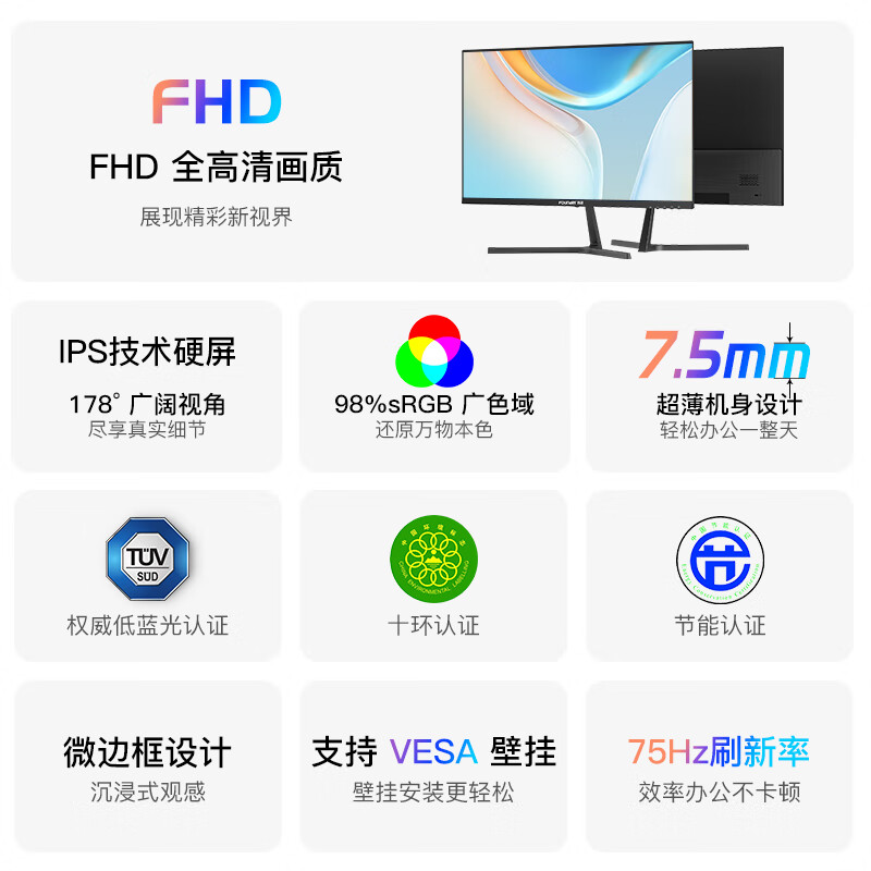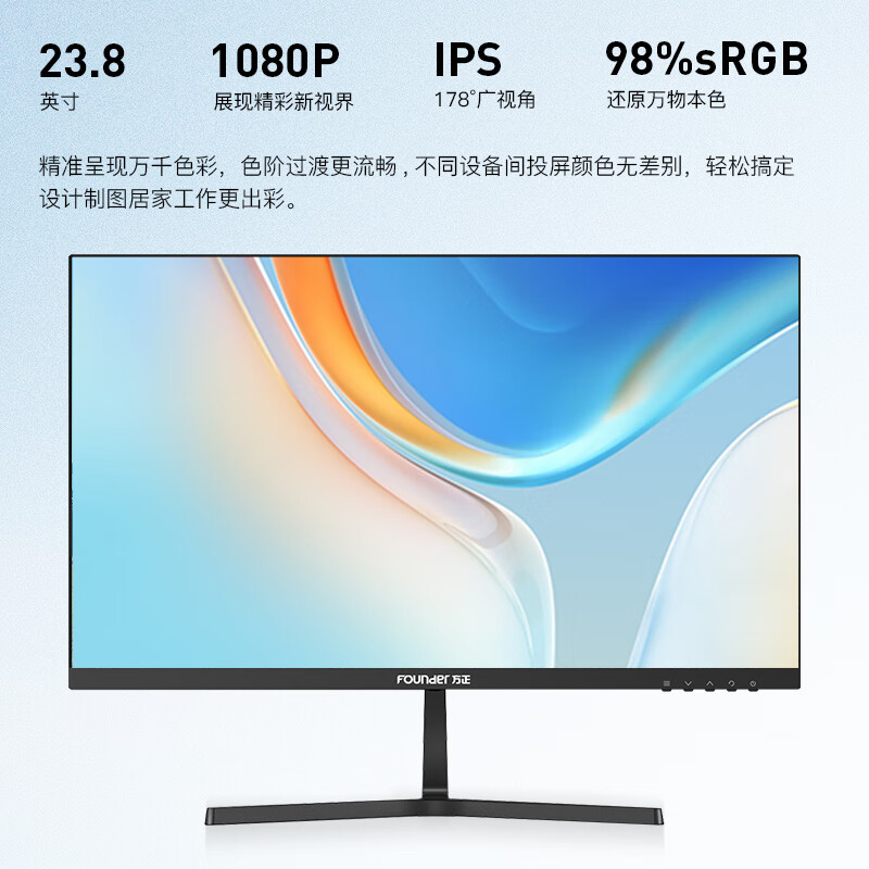 方正(Founder)24英寸IPS电脑显示器 75Hz 窄边框 可壁挂 商务办公 直面高清液晶屏幕 节能低蓝光FC2453D价格:429.00元!