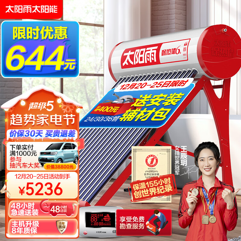 太阳雨 (Sunrain)太阳能热水器 家用全自动上水 光电两用 一级能效配智能仪表电加热保热墙6代36管265L价格:5880.00元!