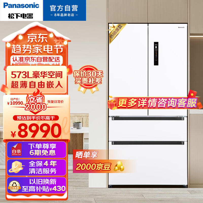 松下(Panasonic)【大海豚】573升法式多门648mm超薄嵌入冰箱四开门大容量一级能效磨砂白家用冰箱NR-EW57TMA-W价格:8990.00元!