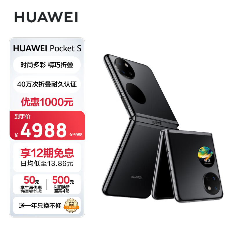 HUAWEI Pocket S 折叠屏手机 40万次折叠认证 128GB 曜石黑 华为小折叠价格:4488.00元!