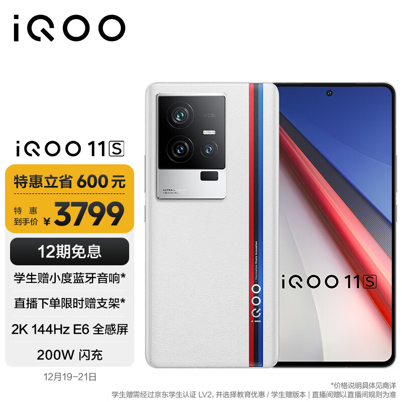 vivo iQOO 11S 16GB+512GB 传奇版 2K 144Hz E6全感屏 200W闪充 超算独显芯片 第二代骁龙8 5G游戏电竞手机价格:4399.00元!
