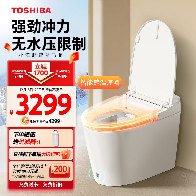 东芝(TOSHIBA)小海豚智能马桶家用虹吸式一体机带水箱小户型电动坐便器A400-400价格:3599.00元!