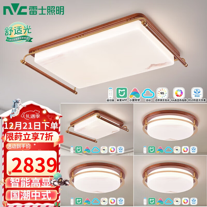 雷士(NVC)吸顶灯客厅灯木艺大尺寸新中式灯具智能高显套餐 WHXD140W/F-03价格:4055.00元!